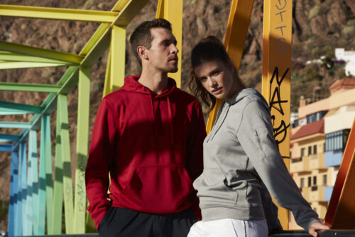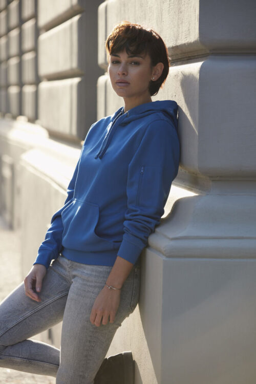 Hettegenser i unisexmodell. Kengurulomme og ton-i-ton glidelåslomme på ermet. Ribb i nedekant og ermavslutning. Tilpasset for hodetelefoner. Spun Dyed. Avtagbar etikett i nakken.