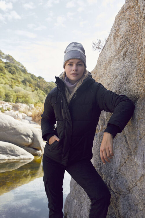 Varm, vattert vinterjakke. Vanntett SBS glidelås på bryst og frontlommer. Avtagbar/justerbar hette. To store innerlommer i mesh. Snorer i bunn. Damemodellen er også utstyrt med snor i midjen. 2×2 ribb i mansjett. WP / MVP 5000/3000