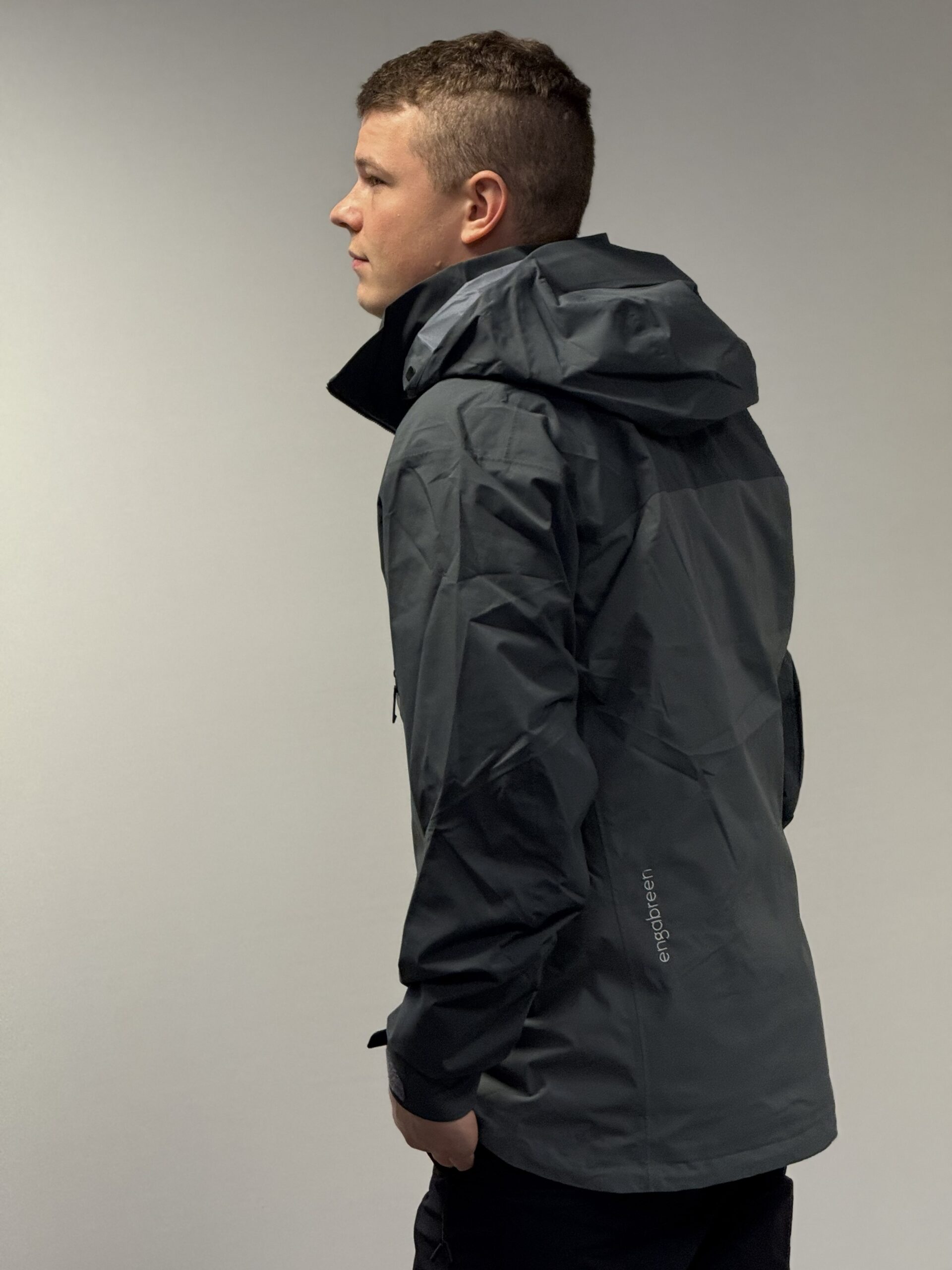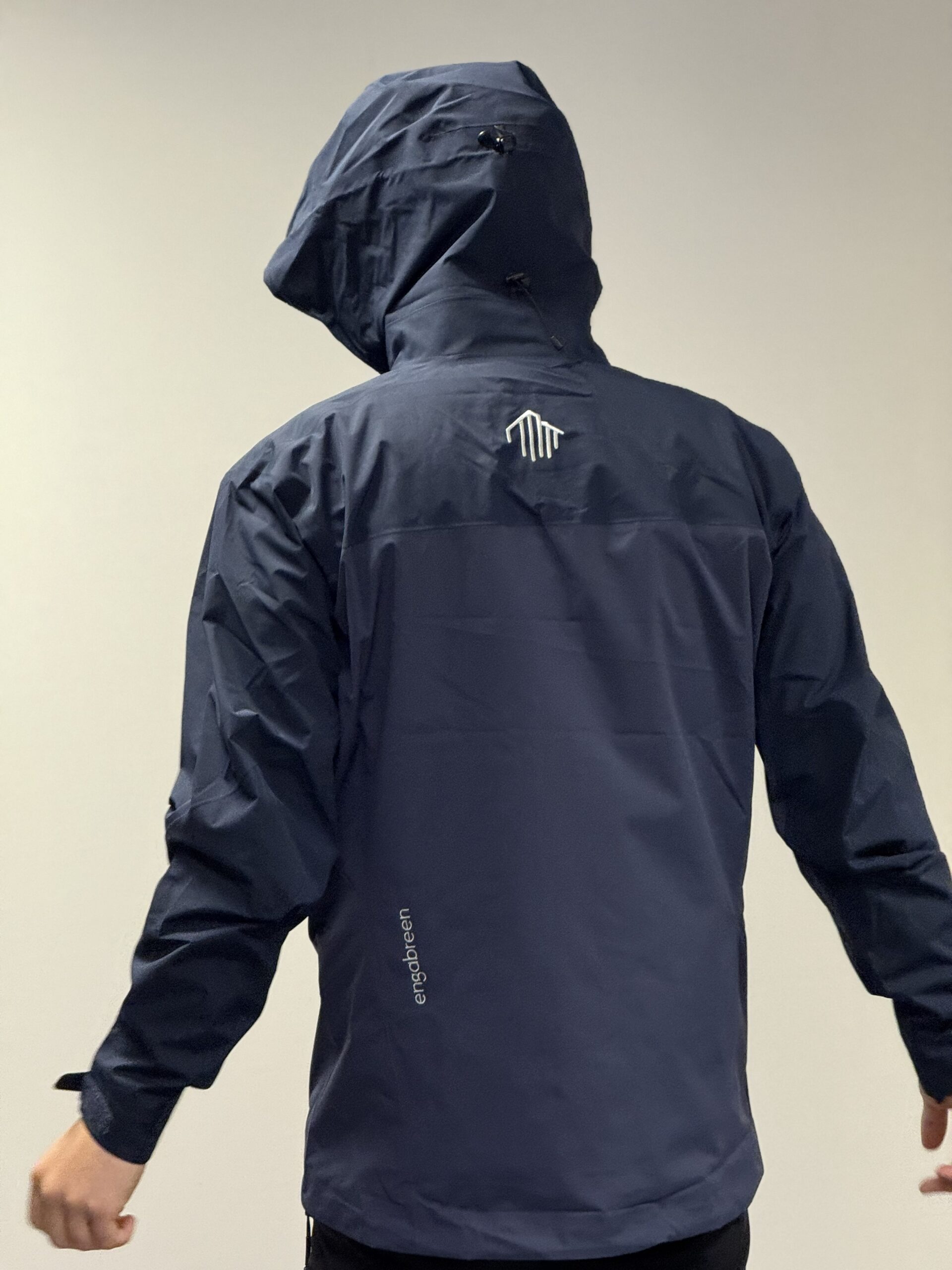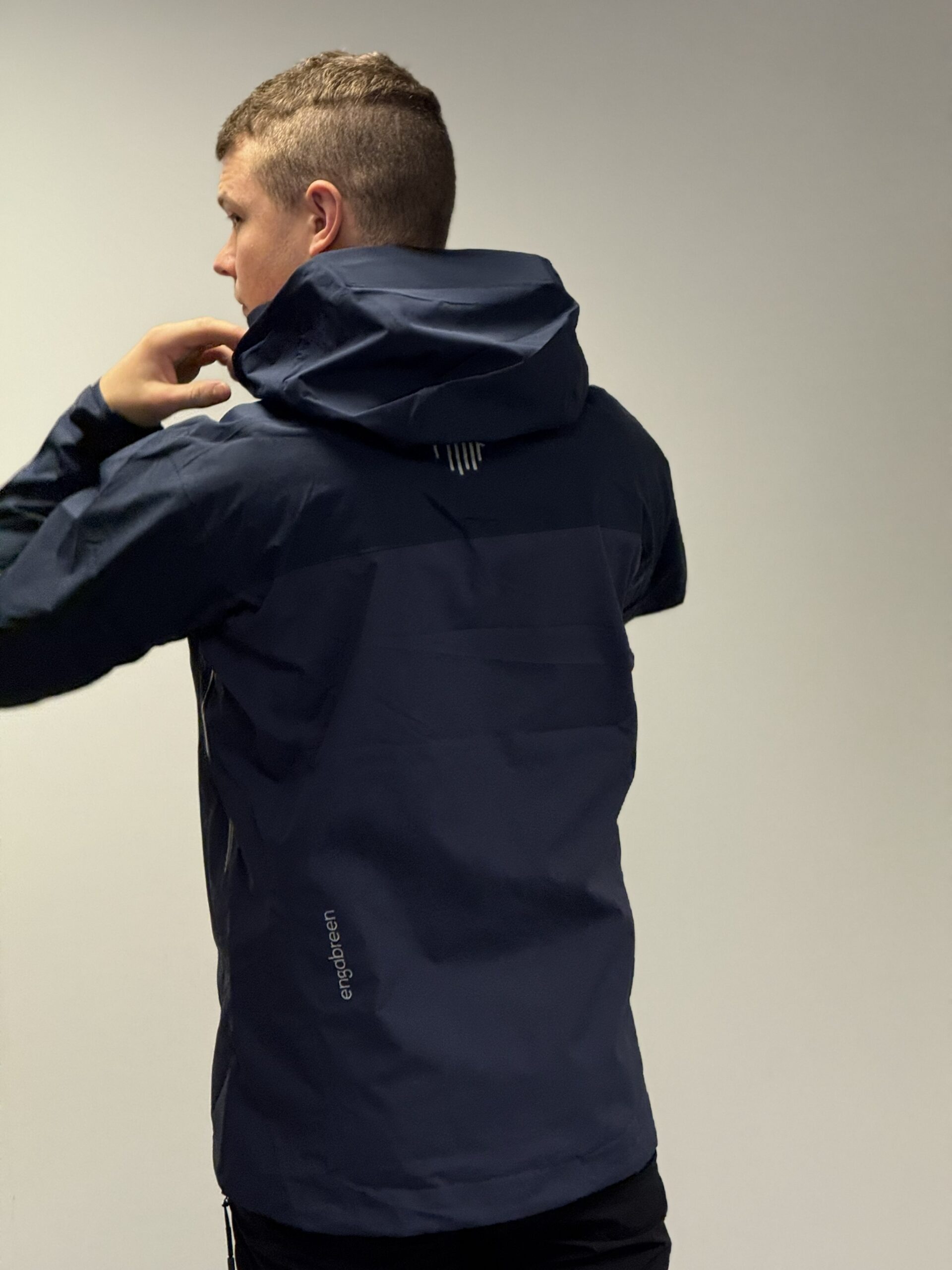Jakken er laget i et pustende og vanntett stoff med høy komfort og lav vekt. Den har ventilasjon under armene, formsydde ermer og justerbar hette for optimal passform.