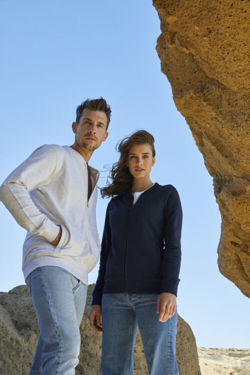 Vår fineste full zip cardigan i en økologisk bomull og resirkulert polyesterblanding. To lommer i front med YKK – glidelås. Dekorative flatlocksømmer for et moderne utseende. CVC french terry, herringbone nakkebånd og ribb i nedekant og ermavslutning. Elastisk ribb i 1×1. Tilpasset for hodetelefoner.