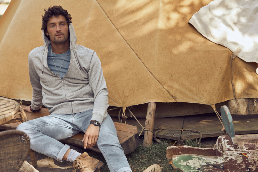 Vår fineste hettejakke i en økologisk bomull og resirkulert polyesterblanding. To lommer i front med YKK – glidelås. Snor i hette med metallavslutning og dekorative flatlocksømmer for et moderne utseende. CVC french terry, herringbone nakkebånd og ribb i nedekant og ermavslutning. Elastisk ribb i 1×1. Tilpasset for hodetelefoner